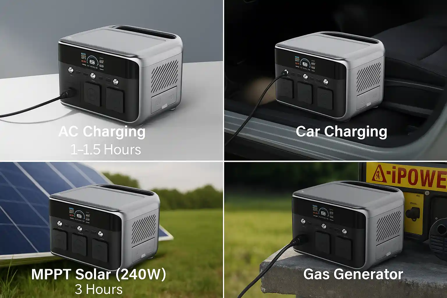 4️⃣ 4 Fast Recharge Options — Quick recharge via AC wall outlet (≈1.5h), car charger, 240W MPPT solar panels (≈3h), or gas generator.